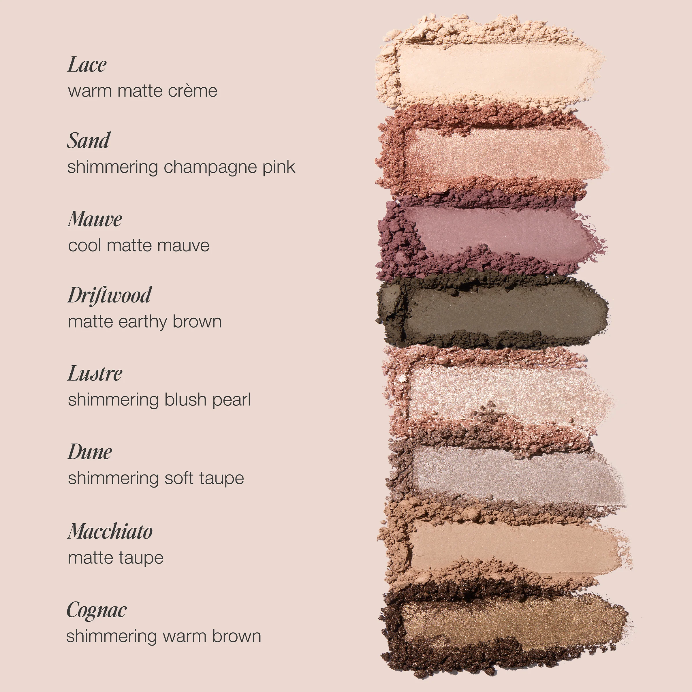 How To Use It: Apply matte shades to define and contour the eyes and layer shimmer shades on the lid or inner corner for a radiant finish. Use dry for a soft wash of color or dampen your brush for added intensity.