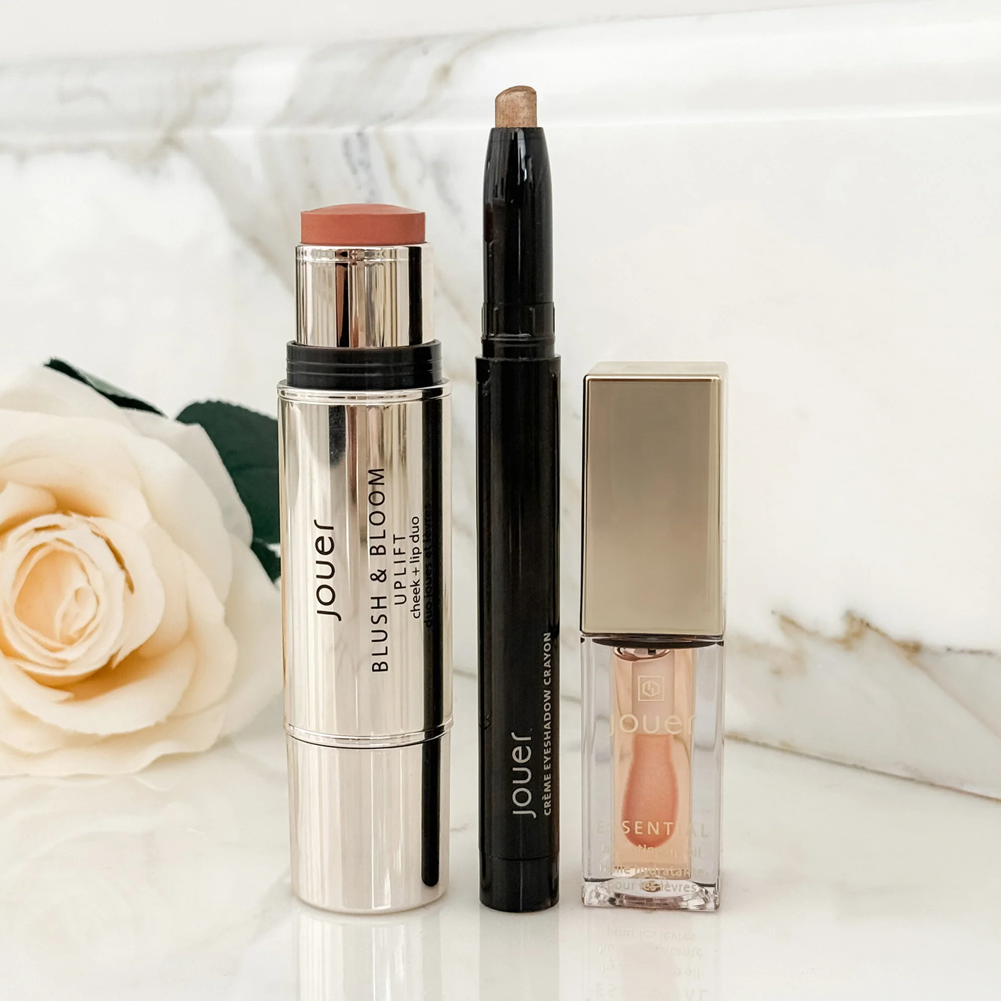 How To Use It: Swipe the Eye Crayon in Cashmere across lids and blend with your fingertip for an effortless glow. Dot the Blush & Bloom Duo in Uplift onto cheeks and high points of the face, then blend for a fresh flush and soft highlight. Finish with the Essential Lip Oil in Natural Shine for a hydrating, high-shine finish.